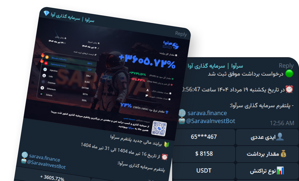 سود پرداختشده در سراوا نتیجهی فعالیت مداوم تیم تحلیلگران و معاملهگران حرفهای این پلتفرم در بازارهای مالی بینالمللی است. کارشناسان سراوا با استفاده از استراتژیهای متنوع و مدیریت ریسک، سرمایهی کاربران را وارد معاملات کمریسک و پر بازده میکنند. به این ترتیب، سود هر بسته سرمایهگذاری از پیش مشخص شده و پس از پایان دورهی آن، اصل سرمایه و سود کاربر بهطور کامل قابل برداشت است. مدل کاری سراوا بهگونهای طراحی شده که حتی در صورت نوسانات بازار، پرداخت سود تضمین شود.